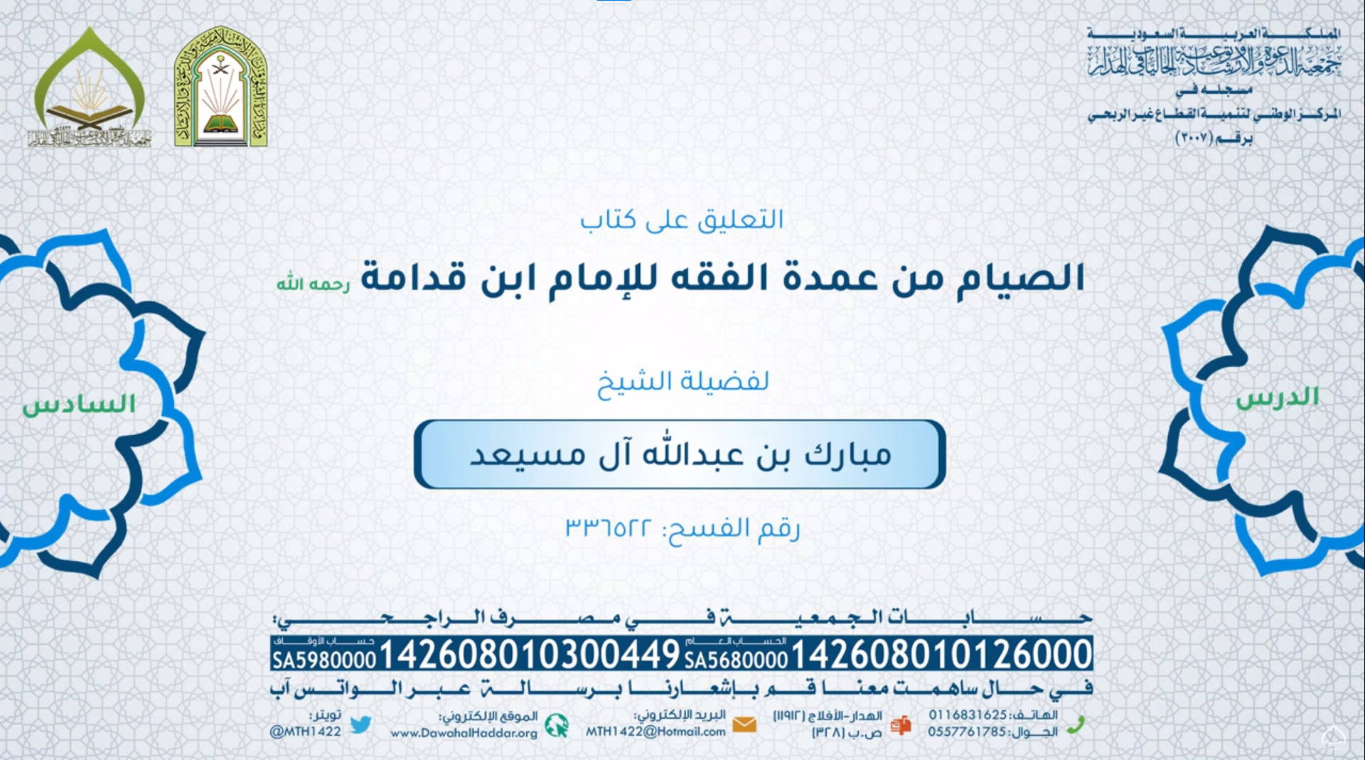الدرس 6 | التعليق على كتاب الصيام من عمدة الفقه التعليق على كتاب الصيام من عمدة الفقه, مكتبة الفيديوبواسطة وحيد مباركالأربعاء 25 ذو القعدة 1444هـ تفاصيل