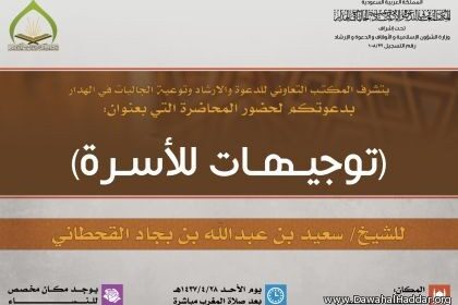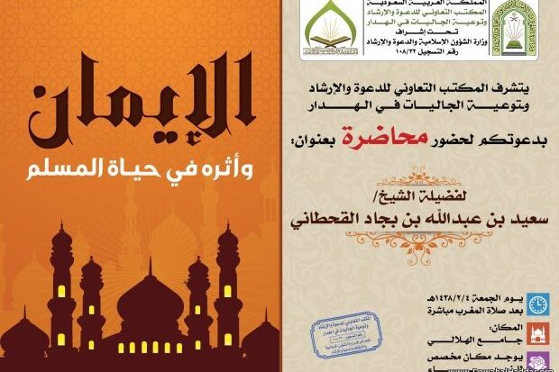 يقيم المكتب التعاوني للدعوة والإرشاد وتوعية الجاليات في الهدار محاضرة بعنوان “التوجيهات الأسرية للشيخ / سعيد بن عبدالله بن بجاد القحطاني وذلك يوم الأحد الموافق 28 / 4 / 1437هـ في مسجد الفلاح.