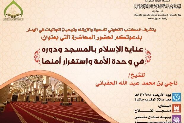 يقيم المكتب التعاوني للدعوة والإرشاد وتوعية الجاليات في الهدار محاضرة للشيخ/ ناجي بن محمد بن عبدالله الحقباني بعنوان (عناية الإسلام بالمسجد ودوره في وحدة الأمة واستقرار أمنها) وذلك يوم الأربعاء الموافق 1437/5/8هـ بعد صلاة المغرب مباشرة في مسجد الفلاح.