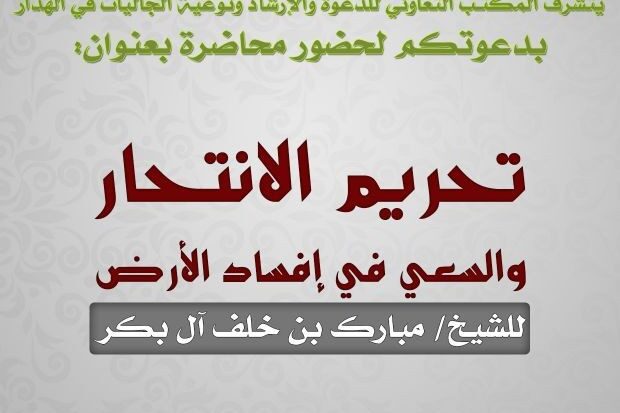 يقيم المكتب التعاوني للدعوة والإرشاد وتوعية الجاليات في الهدار محاضرة للشيخ/ مبارك بن خلف آل بكر بعنوان (تحريم الإنتحار والسعي في إفساد الأرض) وذلك يوم الأحد الموافق 1437/5/19هـ بعد صلاة المغرب مباشرة في مسجد الفلاح.