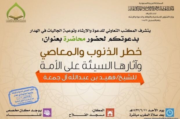 يقيم المكتب التعاوني للدعوة والإرشاد وتوعية الجاليات في الهدار محاضرة للشيخ/فهيد عبدالله آل جمعة بعنوان (خطر الذنوب والمعاصي وآثارها السيئة على الأمة) وذلك يوم الأحد الموافق 1437/6/11هـ بعد صلاة المغرب مباشرة في مسجد الفلاح.