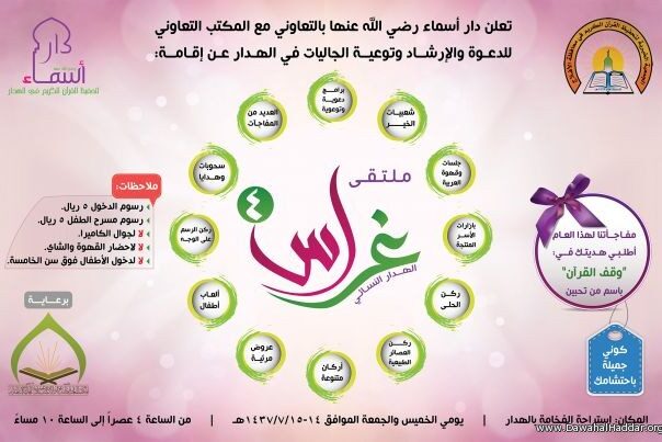 تقيم دار أسماء رضي الله عنها لتحفيظ القرآن الكريم في الهدار “ملتقى غراس الهدار النسائي الرابع” برعاية من المكتب التعاوني للدعوة والإرشاد وتوعية الجاليات في الهدار وذلك يومي الخميس والجمعة الموافق 14-15/7/1437هـ في استراحة الفخامة بالهدار حيث يبدأ الملتقى في تمام الساعة 4 عصراً حتى الساعة 10 مساءً.