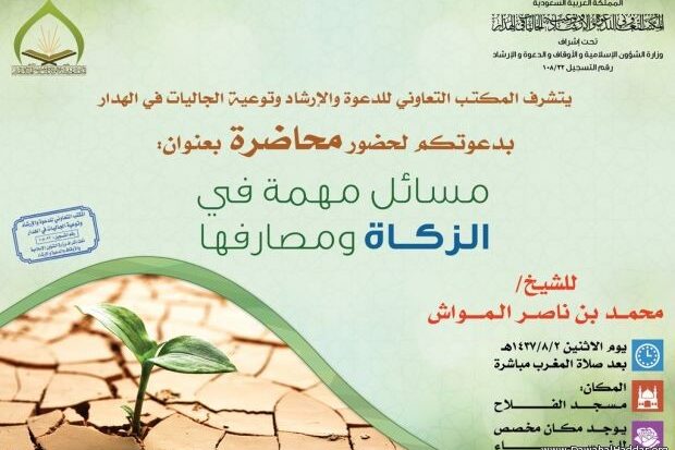 أقام المكتب التعاوني للدعوة والإرشاد وتوعية الجاليات في الهدار محاضرة بعنوان (مسائل مهمة في الزكاة ومصارفها) وذلك في يوم الاثنين الموافق 1437/8/2هـ للشيخ/ محمد بن ناصر المواش في مسجد الفلاح.