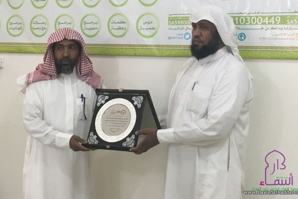 قدمت دار أسماء -راضي الله عنها- للتحفيظ القرآن الكريم (النسائية) درعاً تذكارياً للمكتب التعاوني للدعوة والإرشاد وتوعية الجاليات في الهدار على دعمه لأنشطة الدار طوال العام الدراسي الحالي 1437/1436هـ.