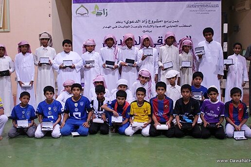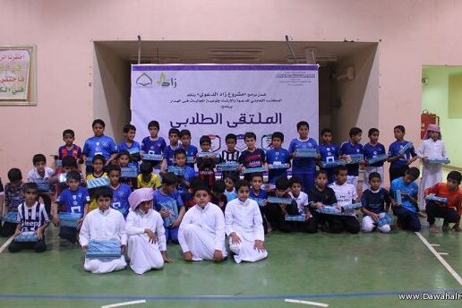 أقام المكتب التعاوني للدعوة والإرشاد وتوعية الجاليات في الهدار ملتقى طلابي للمرحلة المتوسطة ضمن مشروع زاد الدعوي وذلك يوم الأربعاء الموافق 18-1-1437هـ ، في الصالة الرياضية لمدرسة تحفيظ القرآن الكريم بالهدر، حيث شارك (32) طالباً، استفادوا وتفاعلوا مع ما قدم لهم من برامج ومسابقات متنوعة، شملت على دوري رياضي، ومسابقة ثقافية ودرس في أهمية الصلاة…