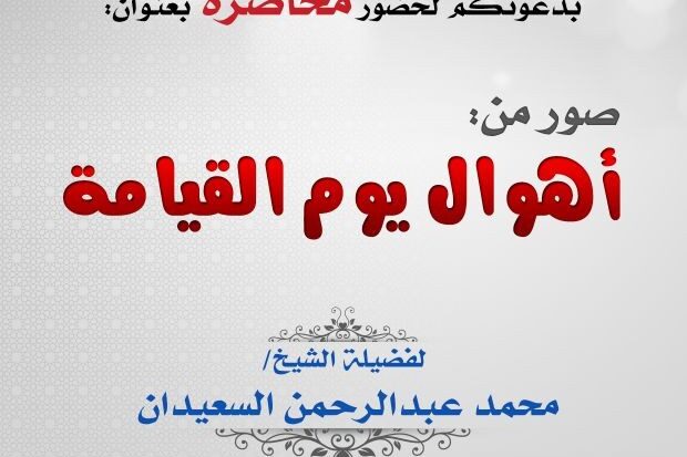 يقيم المكتب التعاوني للدعوة والإرشاد وتوعية الجاليات في الهدار محاضرة للشيخ/محمد بن عبدالرحمن السعيدان بعنوان (صور من أهوال يوم القيامة) وذلك يوم الجمعة الموافق 27-1-1438هـ بعد صلاة المغرب مباشرة في مسجد الفلاح.