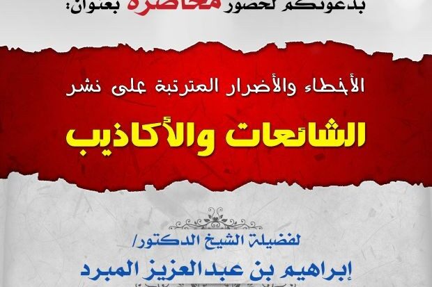 يقيم المكتب التعاوني للدعوة والإرشاد وتوعية الجاليات في الهدار محاضرة للشيخ الدكتور/ إبراهيم بن عبدالعزيز المبرد، بعنوان (الأخطاء والأضرار المترتبة على نشر الشائعات والأكاذيب) وذلك يوم الخميس الموافق 24-2-1438هـ في مسجد الفلاح.