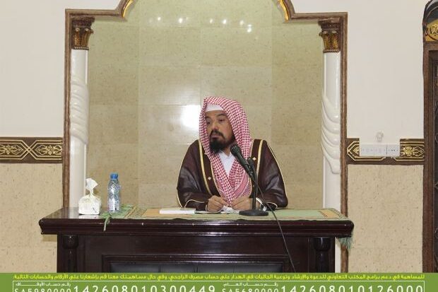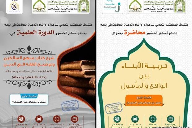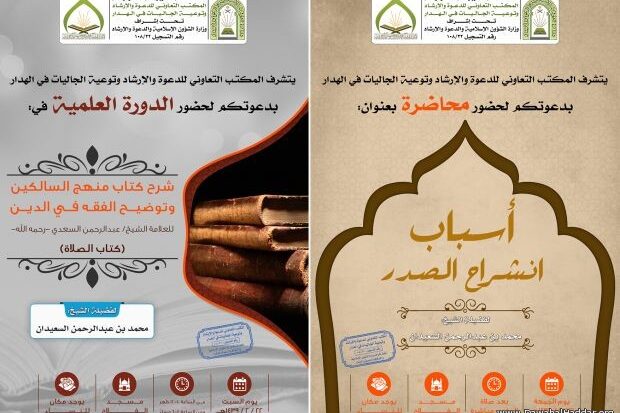 أقام المكتب التعاوني للدعوة والإرشاد وتوعية الجاليات في الهدار محاضرة ودورة علمية للشيخ/ محمد بن عبدالرحمن السعيدان المحاضرة بعنوان (أسباب انشراح الصدر) بعد صلاة المغرب من يوم الجمعة الموافق 21-02-1439هـ، ودورة العلمية في (شرح كتاب منهج السالكين-باب الصلاة) في يوم السبت الموافق 22-02-1439هـ من الساعة 10 صباحاً حتى الساعة 12 ظهراً ومن الساعة 4 عصراً…