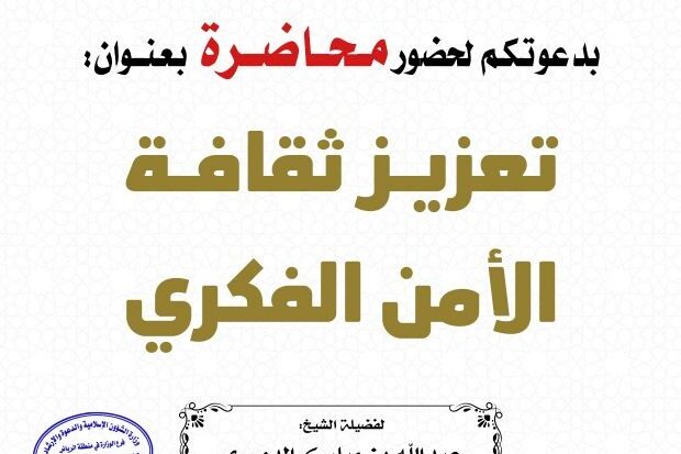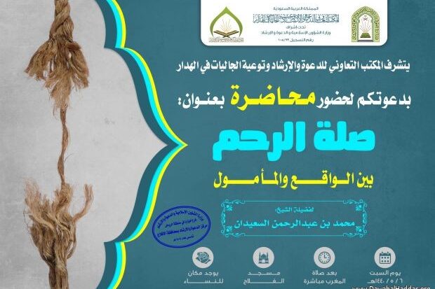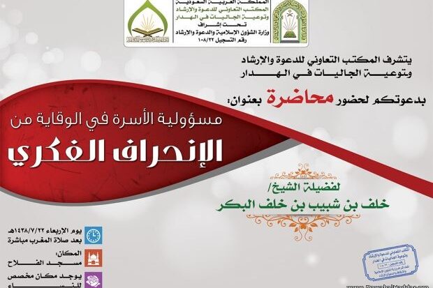 يقيم المكتب التعاوني للدعوة والإرشاد وتوعية الجاليات في الهدار محاضرة للشيخ/ خلف بن شبيب بن خلف آل بكر ، بعنوان (مسؤولية الأسرة في الوقاية من الإنحراف الفكري) وذلك يوم الأربعاء الموافق 22-7-1438هـ في مسجد الفلاح.
