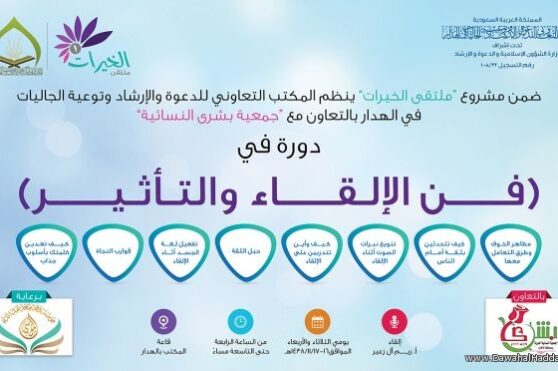 ضمن مشروع “ملتقى الخيرات” ينظم المكتب التعاوني للدعوة والإرشاد وتوعية الجاليات في الهدار بالتعاون مع “جمعية بشرى النسائية”دورة في (فــــــن الإلـقــــــاء والتـأثـيــــــر) في يومي الثلاثاء والإربعاء الموافق 16-17-11-1438هـ تلقيها الأستاذة: ريم آل زعير.