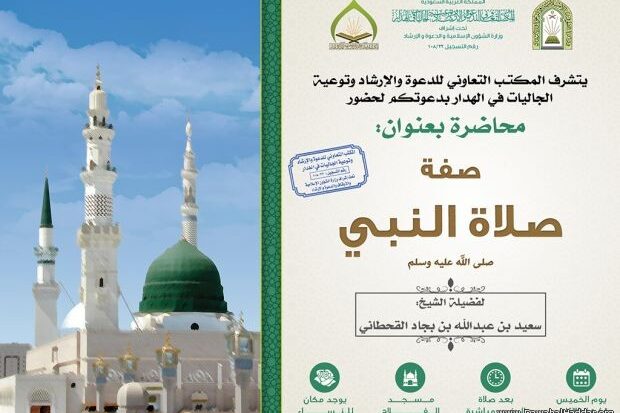 يقيم المكتب التعاوني للدعوة والإرشاد وتوعية الجاليات في الهدار محاضرة للشيخ/ سعيد بن عبدالله بن بجاد القحطاني ، بعنوان (صفة صلاة النبي صلى الله عليه وسلم) وذلك يوم الخميس الموافق 08-05-1439هـ في مسجد الفلاح.