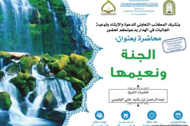يقيم المكتب التعاوني للدعوة والإرشاد وتوعية الجاليات في الهدار محاضرة للشيخ/ عبدالرحمن بن رشيد بن علي الوهيبي ، بعنوان (الجنة ونعيمها) وذلك يوم الخميس الموافق 15-05-1439هـ في مسجد الفلاح.