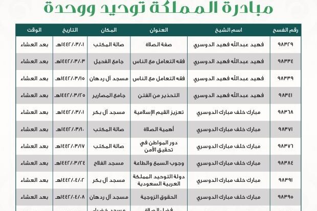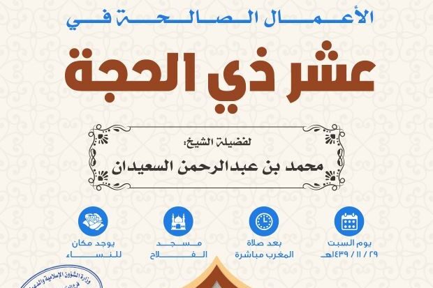 يقيم المكتب التعاوني للدعوة والإرشاد وتوعية الجاليات في الهدار محاضرة (الأعمال الصالحة في عشر ذي الحجة) للفضيلة الشيخ/ محمد بن عبدالرحمن السعيدان وذلك بعد مغرب يوم السبت الموافق 29-11-1439هـ في مسجد الفلاح.