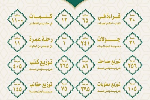 أصدر المكتب التعاوني للدعوة والإرشاد وتوعية الجاليات في الهدار كتيباً يشتمل على (25) مشروعاً دعوياً، لطرحها لراغبين المشاركة في الدعوة إلى الله تعالى وذلك برعاية مشروعاً كاملاً أو بعضاً منه. نسخة عالية الدقة نسخة متوسطة الدقة نسخة منخفضة الدقة