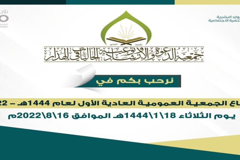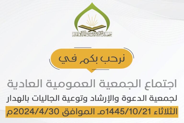 في يوم الثلاثاء الموافق ٢٢/١١/١٤٤٦ الموافق ٢٠/٥/٢٠٢٥ عقدت جمعية الدعوة والإرشاد وتوعية الجاليات بالهدار اجتماع الجمعية العمومية العادية وتم في الاجتماع انتخاب أعضاء مجلس الإدارة الجديد في دورته الثانية المكون من سبعة أعضاء وهم: ١- مبارك بن خلف آل بكر رئيسا لمجلس الإدارة ٢- حزام بن محمد الوداعين نائباً لرئيس مجلس الإدارة ٣- ظافي بن…