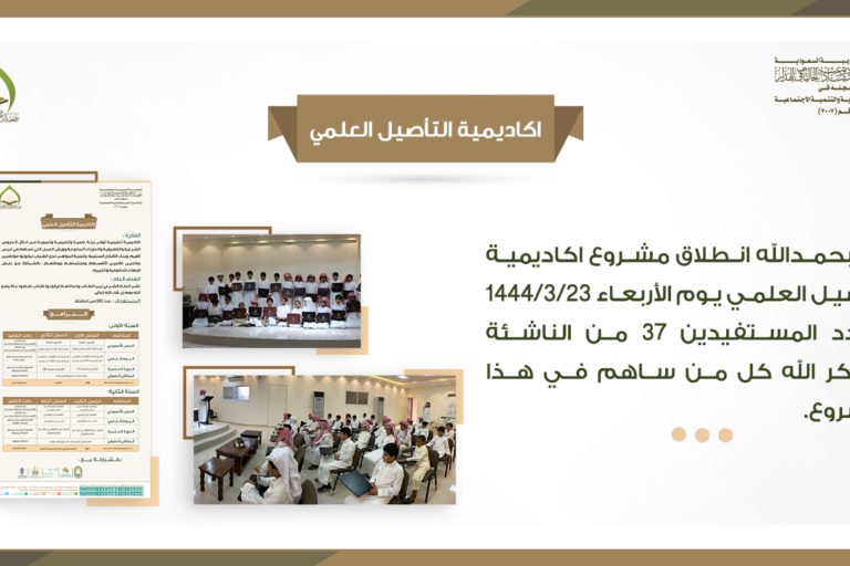 ضمن مشروع زاد الدعوي الثاني، أقيمت ثلاث ملتقيات طلابية للمراحل التالية ( الابتدائية – المتوسطة – الثانوية ) تضمنت توجيهات شرعية وتربوية ومسابقات ثقافية، ومنافسات ترفيهية ورياضية ، تفاعل معها الطلاب مما كان لها الأثر في تحقيق الأهداف المرسومة والمنشودة، بالتعاون مع مدرسة تحفيظ القرآن الكريم و مدرسة عمار بن ياسر. 1 2 3 4…
