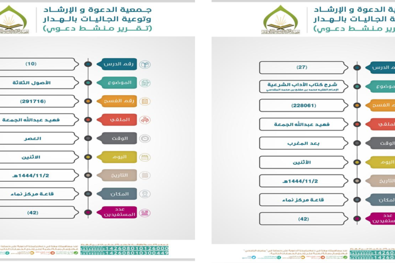 أقامت جمعية الدعوة و الإرشاد و توعية الجاليات بالهدار الدرس الشهري بعنوان شرح ( كتاب السيرة النبوية) للشيخ محمد بن عبد الوهاب رحمه الله. الملقي: الداعية الشيخ محمد بن مسرع خالد الدوسري المكان: مسجد الفلاح عدد الحضور: 50 رقم الفسح: 709652
