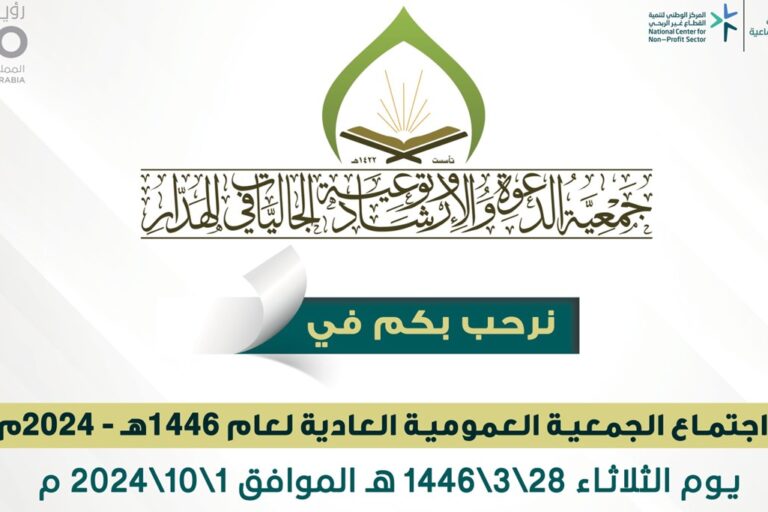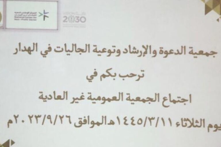 عقدت جمعية الدعوة والارشاد وتوعية الجاليات بالهدار جمعية عمومية وذلك يوم الثلاثاء 1446/3/28 هـ الموافق 2024/10/1 م في مقر الجمعية وذلك لاعتماد الأتي 1- اسماء لجنة الترشيح المكونه منها : 1- عايض بن فيصل الوداعين 2- دعس بن مدهش النتيفات 3- حمد بن زابن المصارير 2- تمديد مجلس الادارة الحالي لستة اشهر قادمة 3- الموافقة…