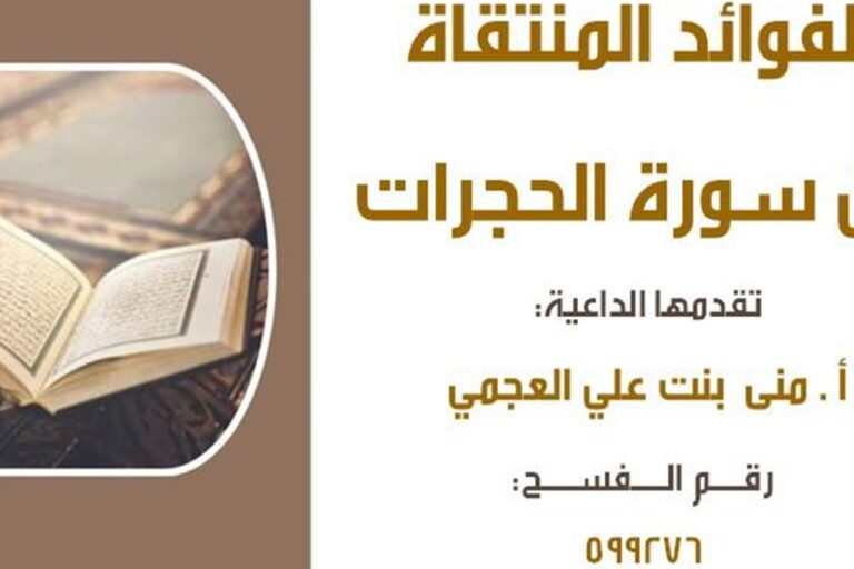 أقامت جمعية الدعوة و الإرشاد و توعية الجاليات بالهدار محاضرة بعنوان ” الفوائد المنتقاة من سورة الحجرات ” للنساء الملقية: الداعية منى بنت علي العجمي المكان: قاعة البيان النسائية عدد الحضور: 90 يوم الثلاثاء الموافق 1446/7/27هـ رقم الفسح: 599276