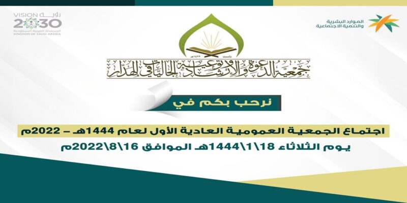 عقدت جمعية الدعوة و الإرشاد و توعية الجاليات بالهدار اجتماع الجمعية العمومية العادية لعام2022م و بحضور ممثلي الجهة المشرفة يوم الثلاثاء18/01/1444هـ الموافق16/08/2022م سائلين الله تعالى للجميع التوفيق و السداد.