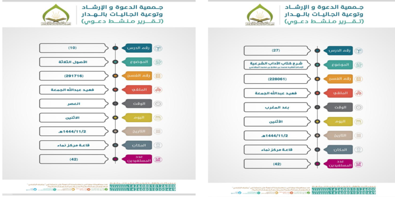 ضمن برنامج تأصيل نفذت جمعية الدعوة و الإرشاد و توعية الجاليات بالهدار درسين علمية. الأول في ” الأصول الثلاثة” و الثاني شرح ” كتاب الآداب الشرعية” لابن المفلح. ألقاها الداعية الشيخ/ فهيد بن عبد الله آل جمعة عدد المستفيدين: 84