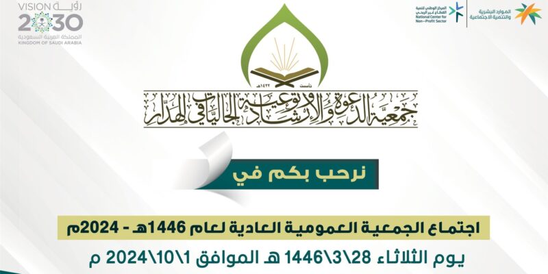 عقدت جمعية الدعوة والارشاد وتوعية الجاليات بالهدار جمعية عمومية وذلك يوم الثلاثاء 1446/3/28 هـ الموافق 2024/10/1 م في مقر الجمعية وذلك لاعتماد الأتي 1- اسماء لجنة الترشيح المكونه منها : 1- عايض بن فيصل الوداعين 2- دعس بن مدهش النتيفات 3- حمد بن زابن المصارير 2- تمديد مجلس الادارة الحالي لستة اشهر قادمة 3- الموافقة…