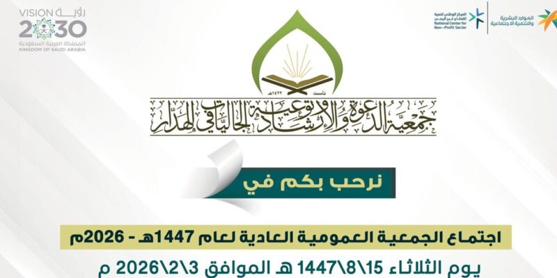 عقدت جمعية الدعوة والإرشاد وتوعية الجاليات بالهدار الجمعية العمومية العادية يوم الثلاثاء 15/8/1447 الموافق 3/2/2026 وذلك بقاعة الجمعية سائلين الله تعالى التوفيق