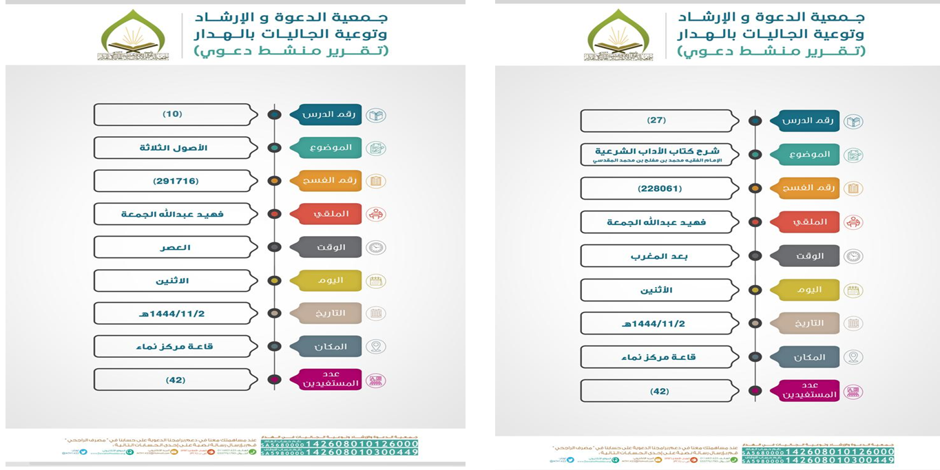 ضمن برنامج تأصيل نفذت جمعية الدعوة و الإرشاد و توعية الجاليات بالهدار درسين علمية. الأول في ” الأصول الثلاثة” و الثاني شرح ” كتاب الآداب الشرعية” لابن المفلح. ألقاها الداعية الشيخ/ فهيد بن عبد الله آل جمعة
